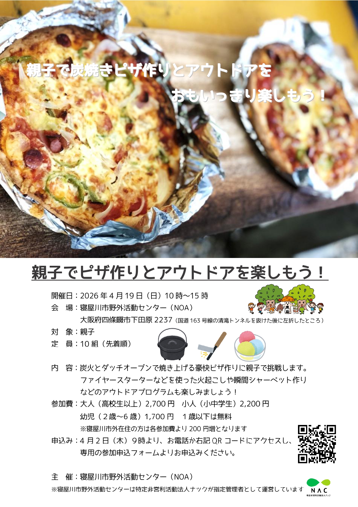 春を迎えたNOAで親子で炭火とダッチオーブンで作るピザ作りに挑戦しませんか?ファイヤースターターなどでの火起こしや瞬間シャーベット作りなどのアウトドアプログラムも楽しみます。
